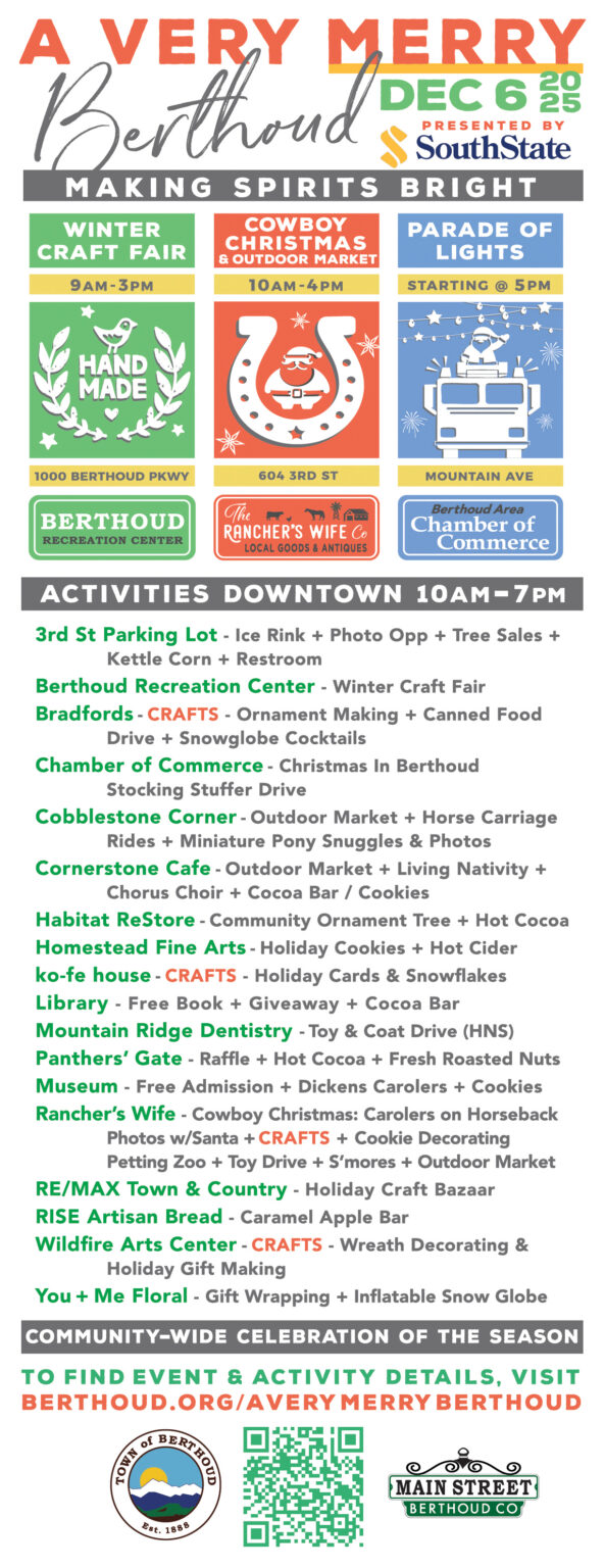 Brought to you by the Town of Berthoud, Berthoud Main Street, and Berthoud Chamber with events provided by local businesses and organizations. Learn more at https://www.berthoud.org/averymerryberthoud
