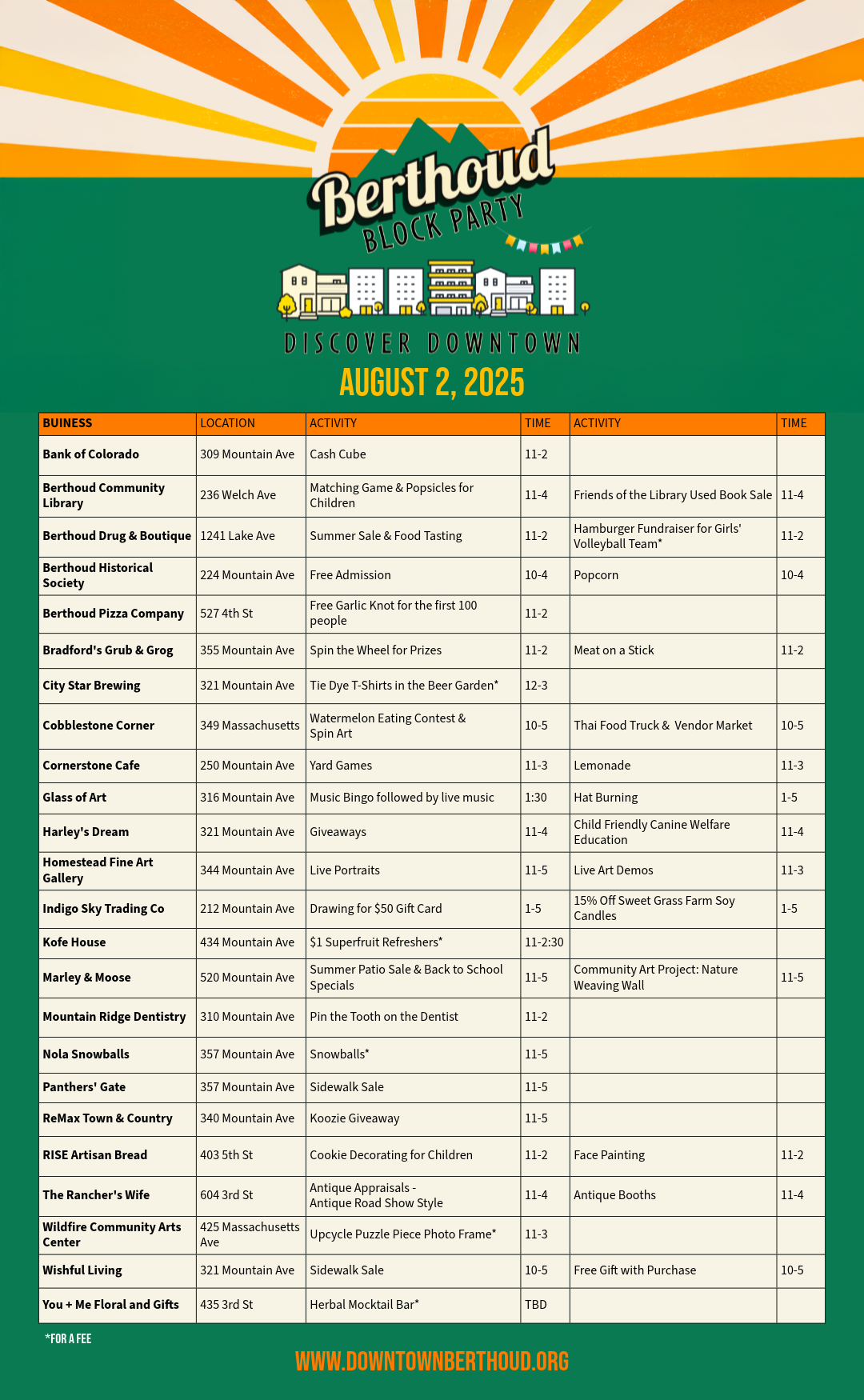 Discover Downtown Berthoud at the Block Party presented by the Downtown Berthoud Merchant Collaborative. Businesses and organizations throughout Berthoud’s historic downtown will offer a variety of entertainment, activity and fun for everyone! Come explore our vibrant downtown district and enjoy all the fun we have in store for you!